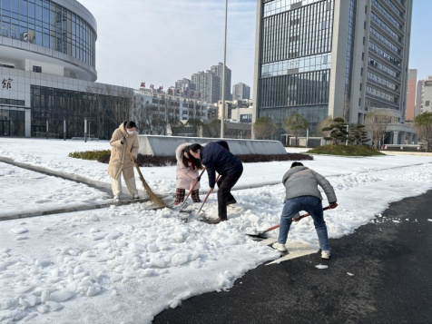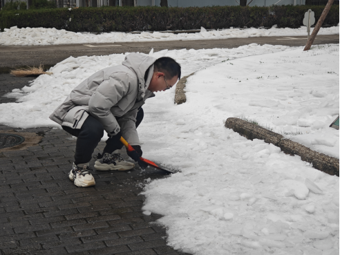 本网讯(通讯员 刘捷/文 各单位/图)近日,伴随着新一轮的低温雨雪冰冻天气来袭,校园内道路积雪结冰严重。开学第一天,学校领导、广大党员干部、教师、辅导员、后勤保卫人员“以雪为令”“迎寒而上”,全力以赴参与到铲冰除雪保畅通攻坚战中,用身体力行的劳动呈现出热火朝天的别样风景,用热辣滚烫的行动为师生开辟出一条条“平安路”“暖心路”。