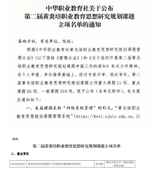 本网讯(通讯员 李开泉/文 刘珍珍/图)根据《中华职业教育社关于公布第二届黄炎培职业教育思想研究规划课题立项名单的通知》(社发〔2024〕2号)获悉,九游(jiuyou)娱乐官方网站WELCOME TO JIUYOU传媒艺术学院欧亚梅老师主持的《黄炎培美育思想视角下的高职非遗创新实践研究》(ZJS2024ZN021)获重点课题立项。第二届黄炎培职业教育思想研究规划课题面向全国高校申报,其中重点课题申报521项,立项55项。