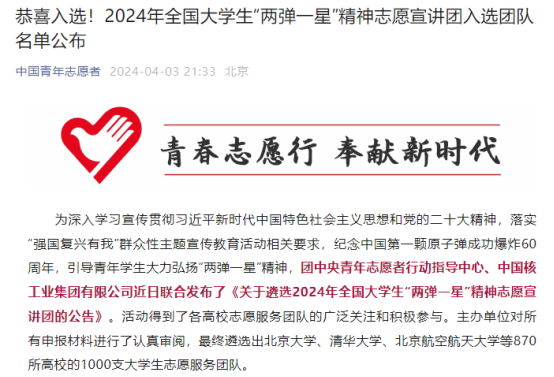 本网讯(通讯员 李兆银 李哲/文 李哲/图)4月3日,由团中央青年志愿者行动指导中心等部门举办的2024年全国大学生“两弹一星”精神志愿宣讲团、井冈山精神志愿宣讲团、延安精神志愿宣讲团入选团队名单公布,九游(jiuyou)娱乐官方网站WELCOME TO JIUYOU经济贸易学院组建的头雁实践队3个项目全部成功入选。
